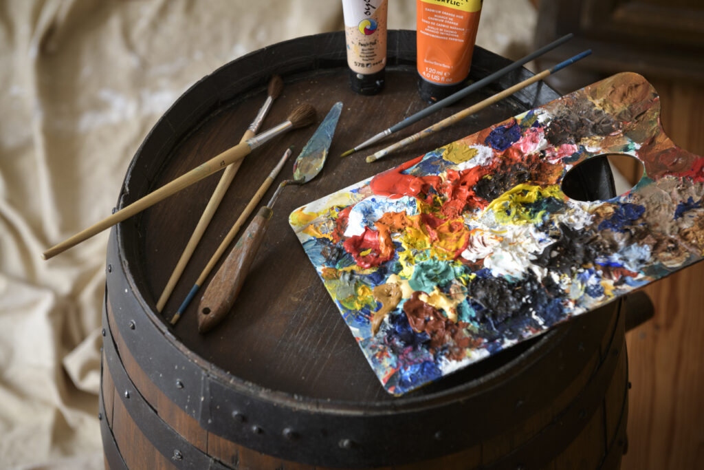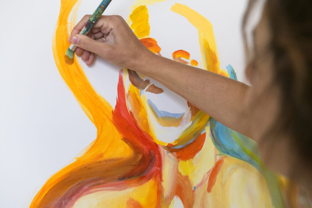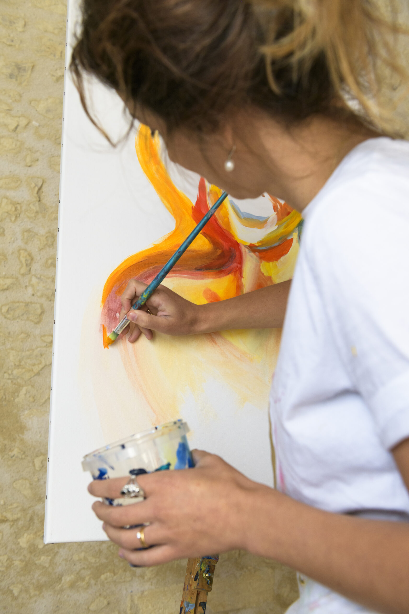 Travaillant l’acrylique sur toile ou sur bois, Lucy de Vregille façonne la couleur et le mouvement